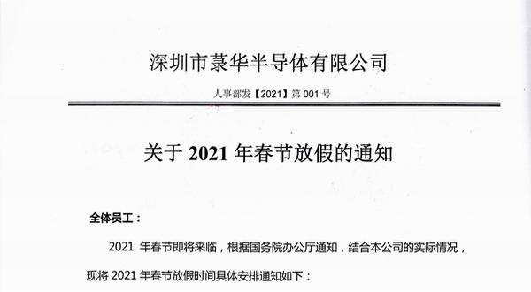2021年春節(jié)即將來臨,根據(jù)國務院辦公廳通知,結合本公司的實際情況,我司2021年春節(jié)放假時間具體安排通知如下:2月7日至2月17日放假調休,共11天;2月18日(初七)正常上班。